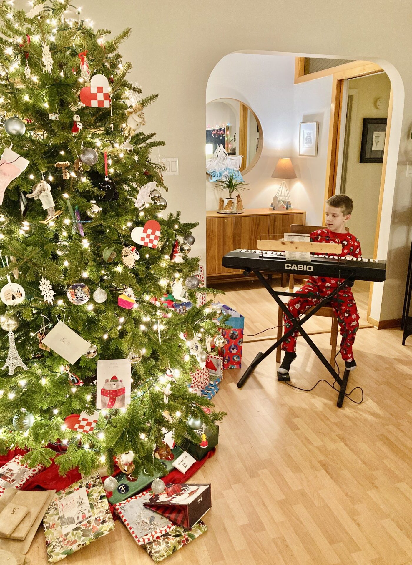 I’ve changed some things up as well. I used to give new PJs on Christmas Eve but now I give them on St. Nicholas Day (Dec 6) so they can wear them throughout the Advent and Christmas season. My mom always made a full turkey dinner for Christmas Day, but I’m usually solo parenting the night of Christmas Eve and at least part of Christmas morning since Nick is a church musician, so I opt for an easy ham and sides. I buy storebought pastries to serve along sausage and bacon Christmas morning and serve it on Christmas-themed paper plates. Basically trying to keep things festive and special but still easy!